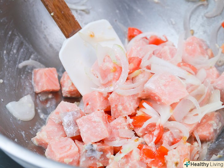 Додайте в миску кубики риби.найчастіше використовується лосось, айський тунець, палтус, тілапія і морський окунь, але для цієї страви можна використовувати багато інших видів риби і морепродуктів. М'ясо повинно бути повністю покрито соком лайма.