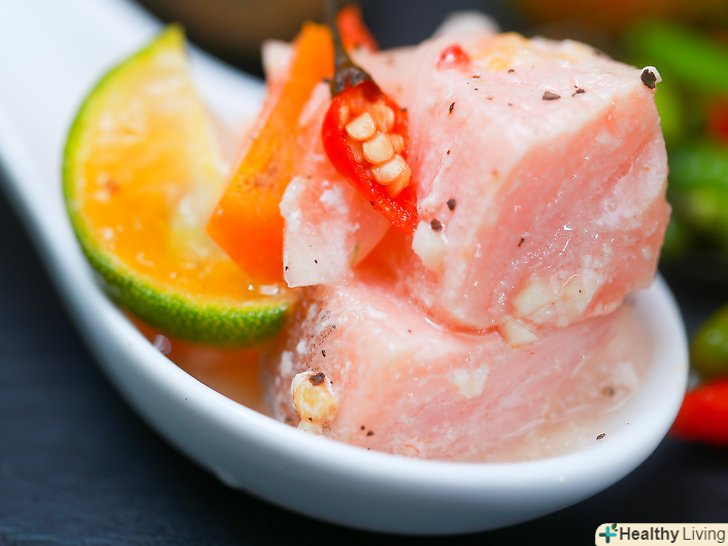 Накрийте миску харчовою плівкою і поставте в холодильник.рибу необхідно маринувати в суміші соку лайма мінімум вісім годин або поки філе не стане білим і матовим. Періодично помішуйте вміст миски, щоб рівномірно розподілити в ній сік.- Кислота в складі соку лайма вступає з м'ясом риби в хімічну реакцію, внаслідок чого риба фактично «готується» без впливу температури.