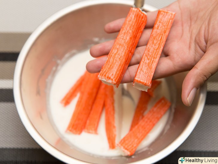 Приготуйте тісто .даний крок необов'язковий, хоча відмінна хрустка скоринка тіста, обсмаженого у фритюрі чудово поєднується з соковитими і ароматними крабовими паличками. Приготувати густе тісто дуже просто: ретельно змішайте разом кукурудзяний крохмаль, борошно, молоко, сіль, харчову соду і воду. Просто опускайте крабові палички в отримане тісто перед обсмажуванням в гарячому маслі.[2]- Темпурное тісто відмінно поєднується з крабовими паличками.