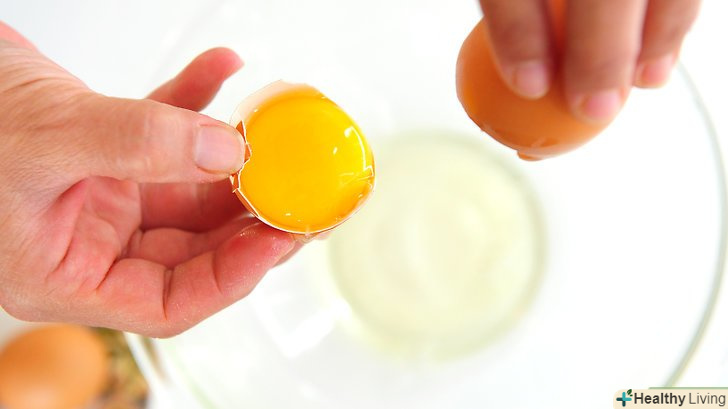 Стукніть яйце (а) об край миски.за допомогою пальців обережно розламайте шкаралупу яйця на дві половини таким чином, щоб жовток залишився в одній з цих половинок. Переконайтеся, що жовток не пошкодився і не капнув в миску разом з білком, так як жир міститься в жовтку не дозволить білку збитися належним чином.