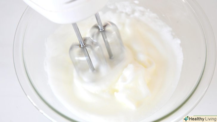 Візьміть віночок або міксер щоб збивати білок до тих пір, поки він не стане густим, але не висушеним на вигляд.найкраще підійде віночок (до речі один з недорогих), який являє собою кілька каплевидних петель з тонкого дроту закріплених на рукоятці! Для зручності нахиліть миску на 45 градусів, під таким же нахилом занурте віночок в білок, і почніть його повільно обертати (здійснювати кругові або спіралеподібні рухи) поступово збільшуючи швидкість для створення циркуляції повітря під час збивання білків і уникаючи сильних махів руки.