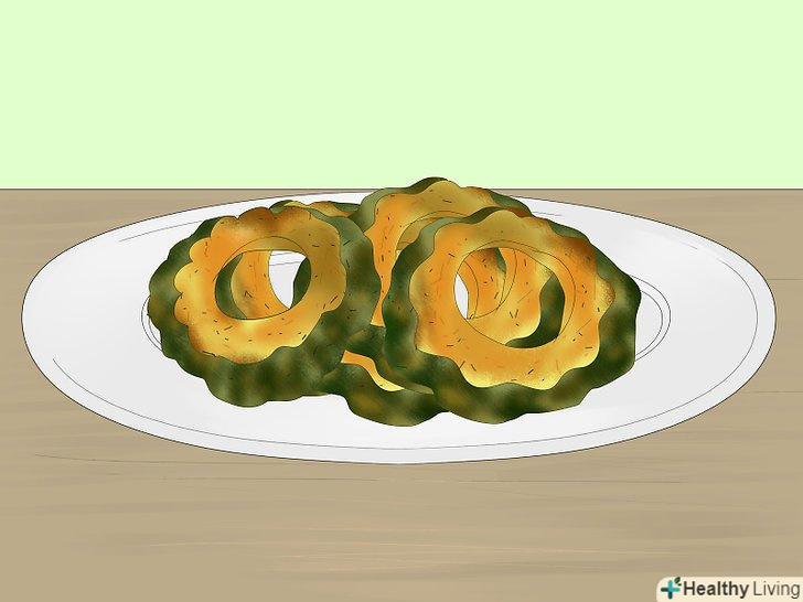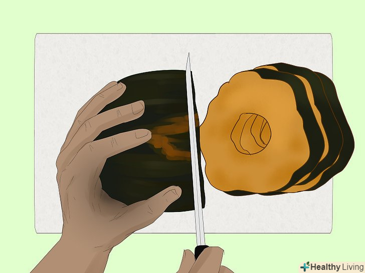 Наріжте гарбуз на кружечки.коли розріжете гарбуз навпіл, зробіть ще один розріз зверху вниз. Потім дістаньте насіння з обох половинок, візьміть гострий ніж і повторно розріжте хрест-навхрест. Так ви отримаєте одне колечко. Продовжуйте нарізати кожен шматочок кільцями.[6]- Товщину кільця вибирайте довільно. У більшості рецептів використовують кільця товщиною від 1 до 1,5 сантиметрів.