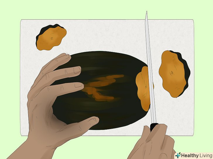 Відріжте кінці гарбуза.акуратно відріжте гострим кухарським ножем 1 сантиметр з кожного краю гарбуза. Так вам буде зручніше тримати гарбуз на одному місці під час нарізки. Кінчики гарбуза можна викинути.[1]- Щоб обробна дошка не ковзала, покладіть на стіл вологу серветку. Поставте на вологу тканину дошку. Тканина дозволить утримати обробну дошку на місці, поки ви нарізаєте гарбуз.