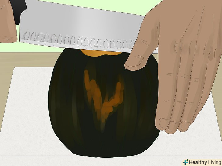 Нарізайте гарбуз плавними рухами.поставте гарбуз таким чином, щоб зрізаний кінець стояв на обробній дошці. Гострим ножем акуратно розріжте гарбуз по центру, похитуючи при цьому рукою. Намагайтеся не розрізати гарбуз відразу. Замість цього наріжте до чверті довжини, а потім поверніть гарбуз і продовжуйте розрізати з іншого боку.[2]- Якщо гарбуз піддається насилу, спробуйте використовувати гумовий молоток і ніж. Вставте ніж у гарбуз і натисніть на вістря гумовим молотком. Це дозволить розрізати гарбуз.