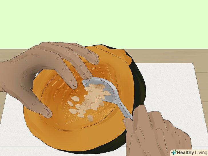 Дістаньте насіння.візьміть велику ложку і дістаньте все насіння і мембрани з кожної половини гарбуза. Використовуйте металеву ложку або ложку з твердою ручкою, яка не зігнеться.[3]- Можете викинути насіння або залишити і пізніше підсмажити на сковороді.