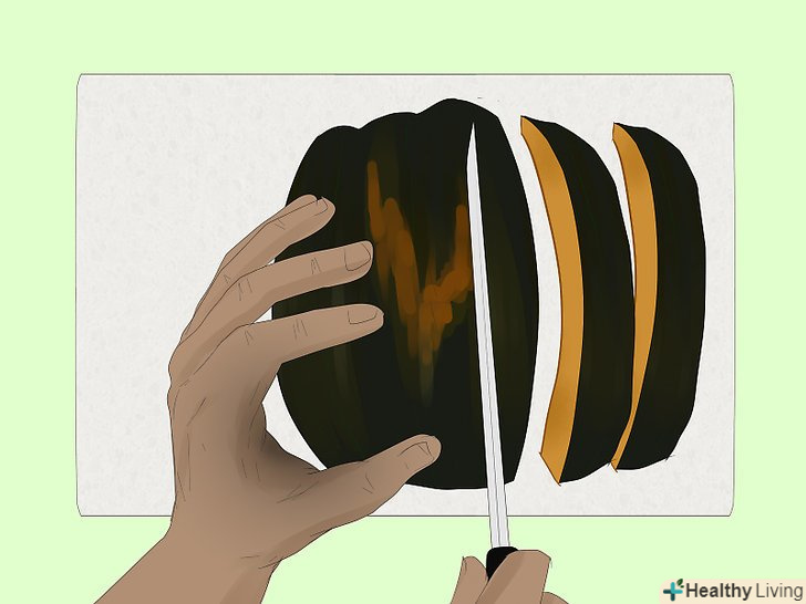 Наріжте гарбуз на часточки.покладіть половину гарбуза м'якоттю вниз на обробну дошку. Розріжте половину на скибочки шириною в 1-1, 5 сантиметра, ретельно прорізаючи їх до кінця по всій довжині.[4]- Вам не доведеться попередньо чистити гарбуз.