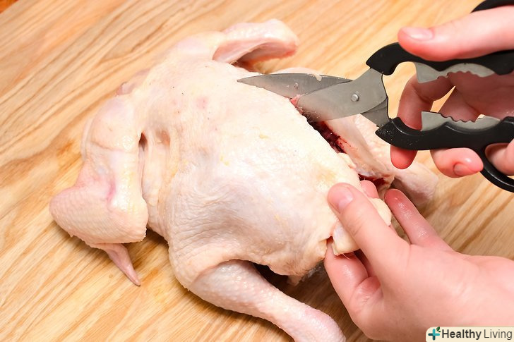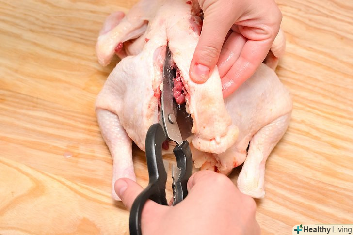 Розріжте уздовж хребта кухонними ножицями.почніть поруч з хвостом, розмістивши частину ножиць в порожнину курки. Розріжте ножицями маленькі кістки, що йдуть уздовж хребта. Ріжте, поки не дійдете до шиї.- Переконайтеся, що ножиці, які ви використовуєте, досить гострі, інакше буде важко розрізати м'ясо і кістки.