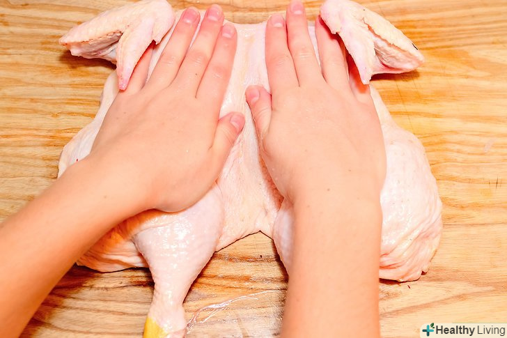 Переверніть курку і притисніть. Переверніть її грудьми вгору. Натисніть на неї руками, щоб зробити плоскою. Ви повинні почути тріск грудини, коли вона буде подаватися під вашою вагою. Ви обробили курку під Батерфляй!- В якості альтернативи, для розламування грудини ви можете використовувати гострий ніж.