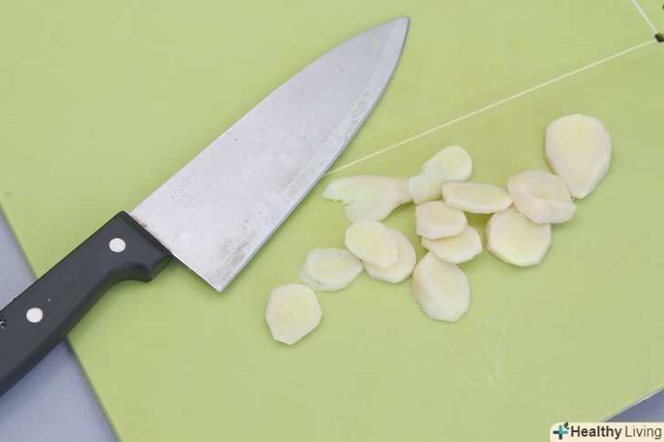 Наріжте імбир на шматки у формі медальйонів.просто наріжте кружальцями, що нагадує за формою медальйони. Наріжте таким чином весь наявний імбир.
