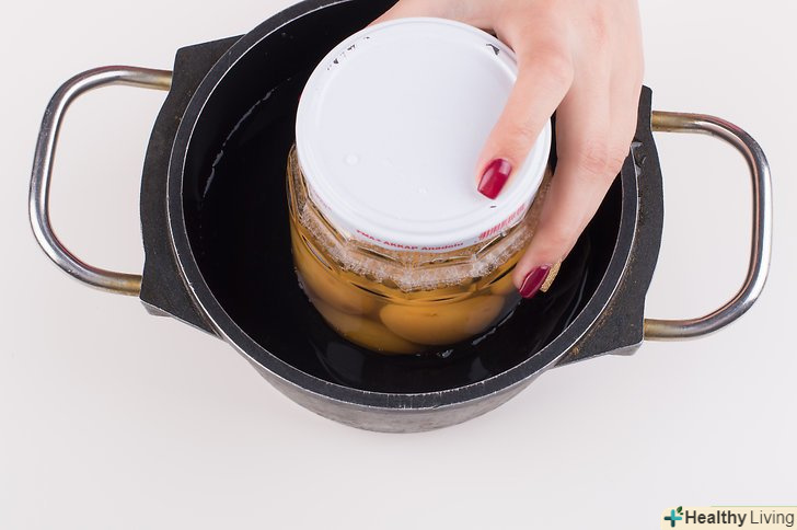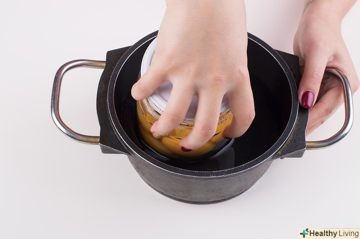Обробіть банки.за допомогою щипців обережно опустіть кожну банку в скороварку. Коли будете розставляти банки, переконайтеся, що вони не стосуються один одного, інакше вони можуть лопнути. Ви можете прокип'ятити банки в каструлі зі спеціальною підставкою (якщо скло буде стосуватися дна, воно може лопнути) або ж зробити це в скороварці (з регулюванням циферблатом або вагою), однак, тривалість обробки буде залежати від обраного Вами методу.- Відзначте, що час обробки холодної консервації буде відрізнятися від гарячої консервації в разі, якщо ви скористаєтеся каструлею з киплячою водою (з підставкою під банки), але залишиться тим же при використанні скороварок.