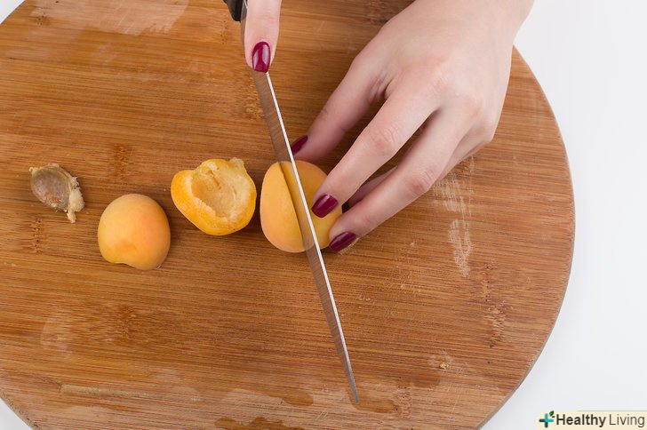 Наріжте абрикоси на половинки.кухонним ножем розріжте кожен абрикос навпіл. Вийміть кісточки, і, якщо хочете, наріжте абрикоси на часточки зручного розміру.- Ви можете на мить занурити кожну половинку або шматочок абрикоса в розбавлений лимонний сік, щоб уберегти фрукти від втрати кольору і потемніння.
