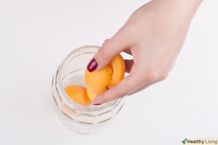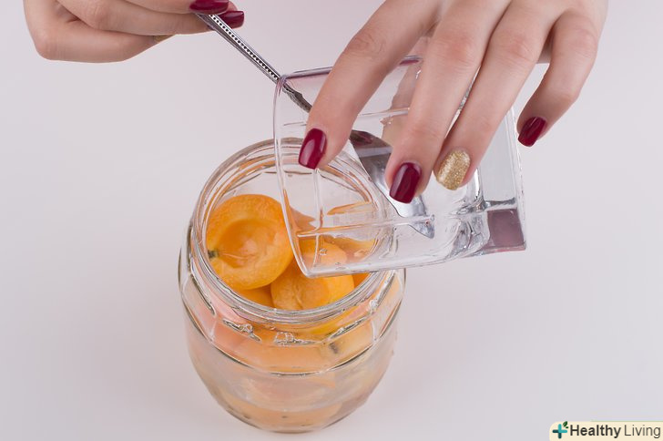 Складіть абрикоси в банку.наповніть банку половинками або шматочками абрикосів, залишаючи близько півтора сантиметрів вільного простору під кришкою кожної банки.- Складіть фрукти в банку, розрізаної стороною вниз. Так вам буде легше помістити в банку більше фруктів.