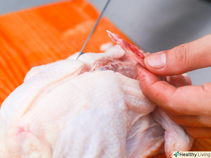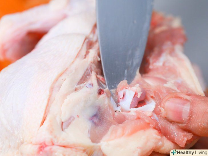 Витягніть суглоб ноги і розріжте його.візьміться за ногу однією рукою, а за ділянку тушки у суглоба ноги - інший. Зігніть ногу назад покрутіть її трохи, щоб суглоб відламався. Відріжте суглоб ноги кінчиком ножа, знайдіть розрив між кісткою і западиною, так само як ви робили з крилом.