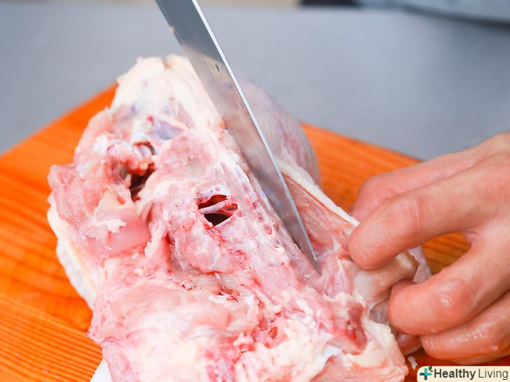 Переверніть тушку і зробіть те ж саме.почніть обробляти іншу сторону хребта, працюючи ножем і зупиняючись, щоб відокремити ножні і крильові суглоби, перш ніж продовжити.- Крім того, ви можете перейти до наступного кроку і відокремити ножні і крильові суглоби, перш ніж почати обробляти іншу сторону. Продовжуйте видаляти кістки, поки не відокремили грудку повністю від м'яса, щоб легше вирізати її.