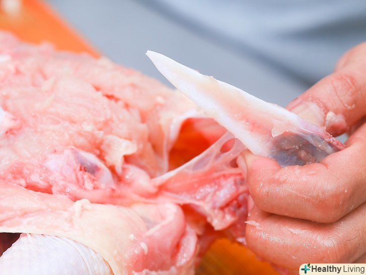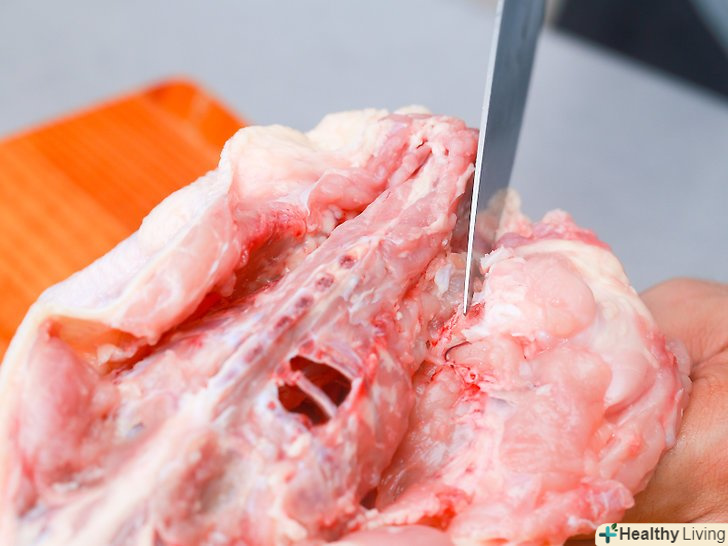 Почніть працювати ножем вниз по грудях.візьміться за шкіру з одного боку і (акуратно!) відріжте м'ясо від кістки, вільно потягнувши його.- Почніть, захопивши шкіру поруч з хребетного відрізу, який знаходиться найдалі від вас. Ріжте якомога ближче до кістки, і нехай ніж робить всю роботу.