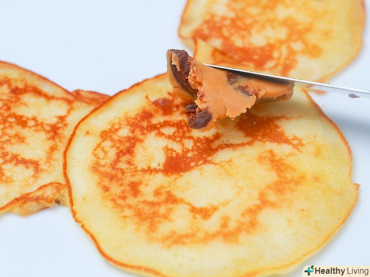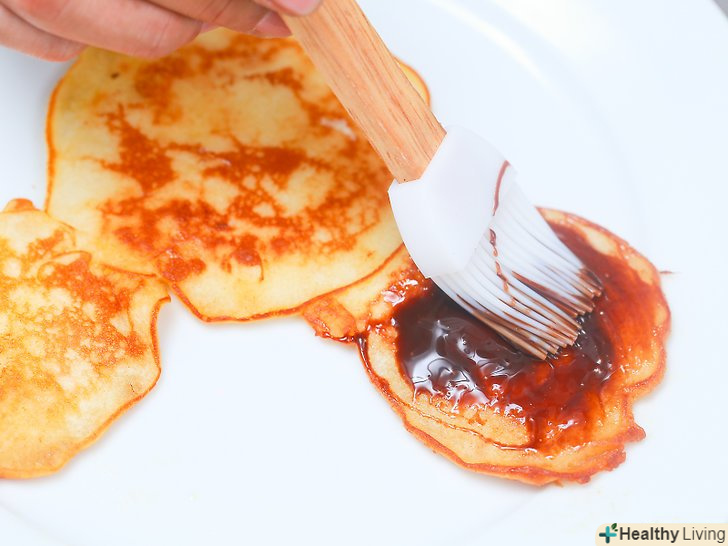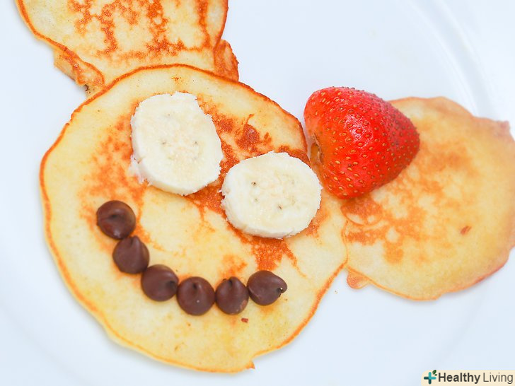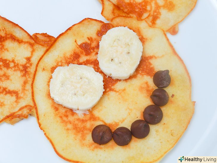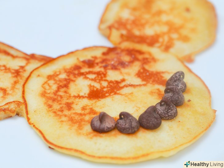 Викладіть посмішку з шоколадних пластівців або ягід.хочете зробити гостям або Дитині приємний сюрприз? Тоді надайте тесту чудовий смак, зробивши пику Міккі Маусу. Для належного результату вам знадобляться солодкі інгредієнти темного кольору (такі як шоколад або чорниця), щоб можна було легко розглянути (і спробувати) посмішку!- Покладіть тісто на сковорідку і додайте зверху ротик і очі. Це дасть продуктам час впечататься в оладки, тому вони не відпадуть надалі.
