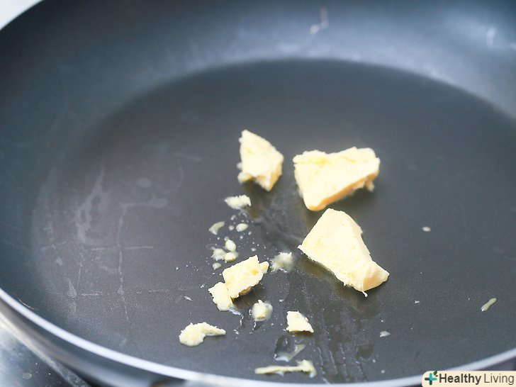 Нагрійте масло в широкій сковороді або сотейнику.Візьміть досить велику порцію вершкового масла (однієї-двох столових ложок буде достатньо) і покладіть її на сковорідку. Нагрійте на середньому вогні. Воно повинно швидко розтопитися. Змастіть всю поверхню сковороди, щоб рівномірно покрити її дно.- Для смаження оладок краще підійдуть дуже широкі сотейники-пам'ятайте, що для величезних вух мишеняти на дні має бути достатньо місця.