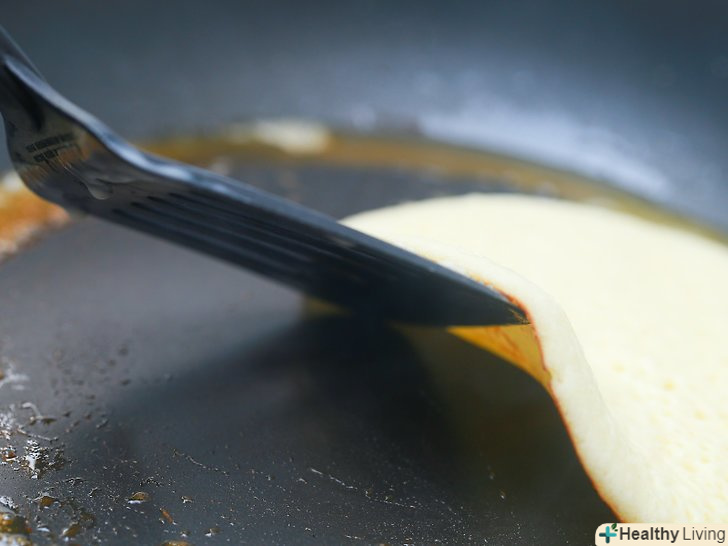Перевірте, чи готова нижня сторона.смажте оладки, поки не почнуть з'являтися, а потім лопатися бульбашки, залишаючи "відкриті" ділянки на поверхні тіста.[3] Подденьте край оладки дерев'яною або металевою лопаткою і загляньте під неї. Оладкою пора перевертати, якщо її нижня сторона придбала золотисто-коричневий відтінок. Якщо ж вона як і раніше світлого кольору, залиште смажитися протягом додаткової хвилини-двох.- Чим товщі оладки, тим більше часу знадобиться, щоб вона досягла точки "перевороту".