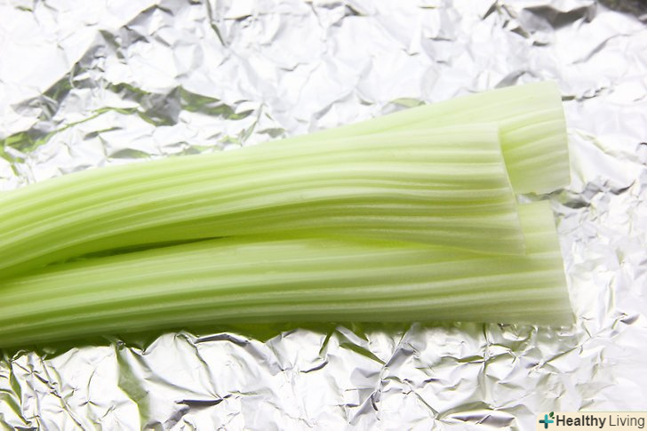 Загорніть селеру у фольгу.візьміть шматок фольги, на 2 сантиметри довше і на 4 сантиметри ширше, ніж ваш селера. Щільно загорніть селера в фольгу, краю підверніть. Листя будуть залишатися свіжими, якщо будуть зберігатися в герметичній упаковці, тому стежте, щоб всередину не потрапило повітря.