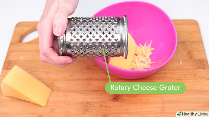 Наріжте сир на тертці, що обертається.цей кухонний інструмент складається з ручки, що з'єднується з круглими дисками з ножами. Ручка обертає диск, щоб натерти сир.[5] відкрийте кожух, покладіть маленький шматок сиру в відділення і крутите ручку.