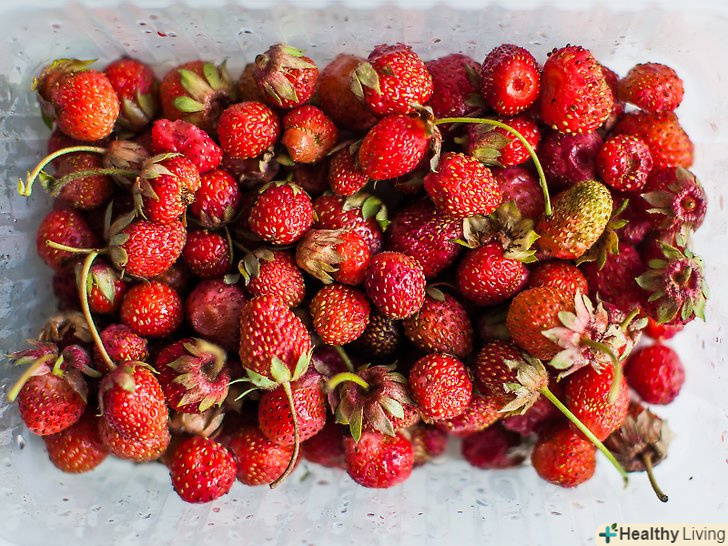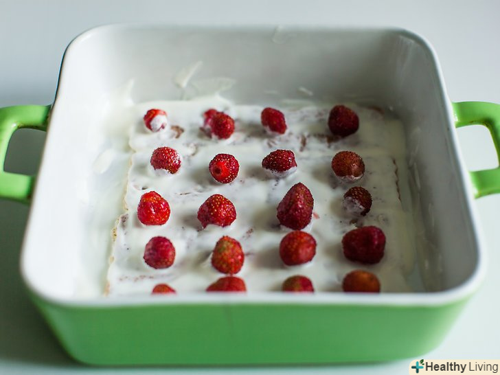 Підготуйте полуницю.помийте полуницю і акуратно промокніть її, щоб висушити. Обріжте стебла і наріжте полуницю тонкими скибочками. Прибережіть кілька найбільш красивих ягід для того, щоб прикрасити кекс зверху.- Якщо вам не подобається Полуниця, можна використовувати інші м'які фрукти, наприклад банани, лохину або манго.[21]