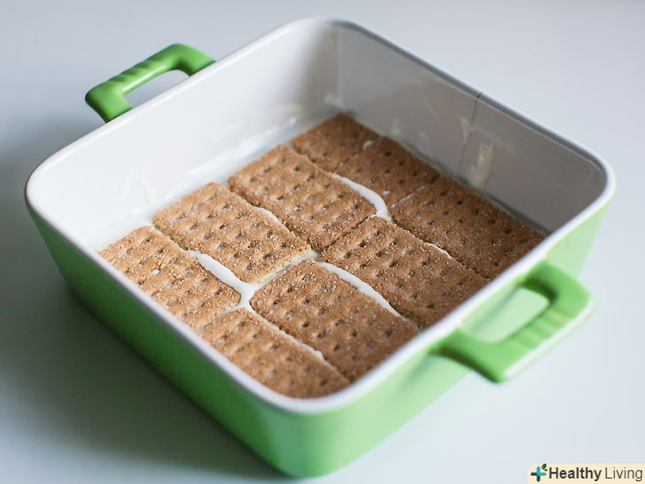 Покладіть на дно страви кілька крекерів з цільнозернового борошна.якщо ви використовуєте деко 23х33 сантиметрів, вам знадобиться приблизно 6 крекерів.[23] використовуйте достатньо крекерів, щоб повністю закрити ними дно страви.- При необхідності можна розламати частину крекерів на більш дрібні шматочки, проте не кришити їх.