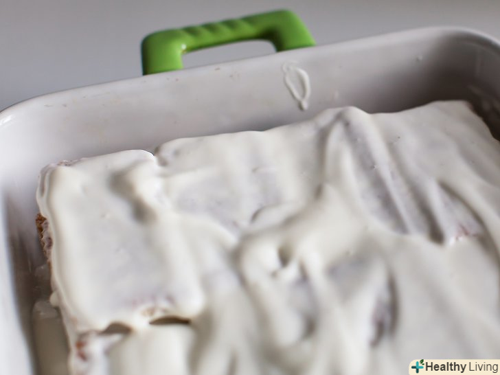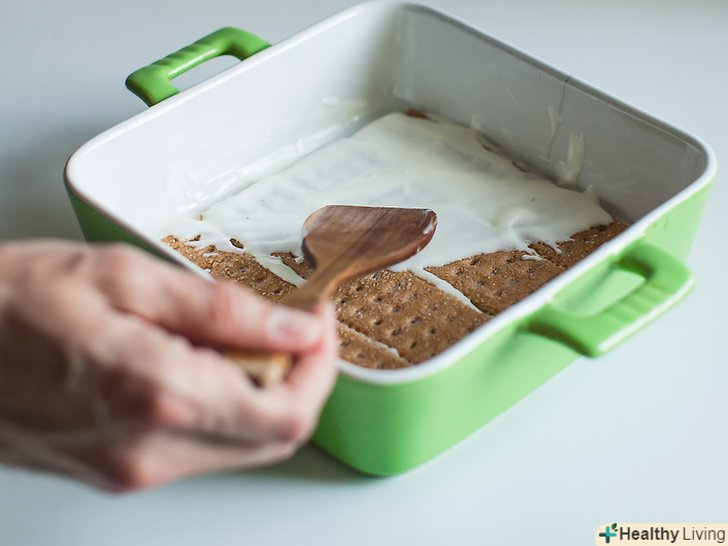 За допомогою гумової лопатки нанесіть трохи збитих вершків на дно прямокутного дека 23х33 сантиметри.досить буде однієї ложки. Цей тонкий шар вершків допоможе утримати на місці перший шар крекерів.[22]- Подумайте про використання скляної тарілки. В цьому випадку ви зможете простежити, щоб різні шари залишилися на місці.