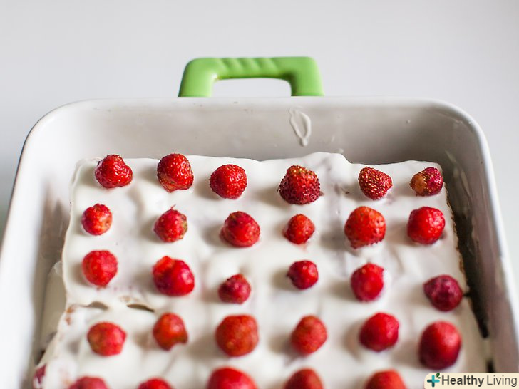 Прикрасьте кекс полуницею, яку ви відклали раніше.можна залишити ягоди цілими або нарізати їх скибочками.
