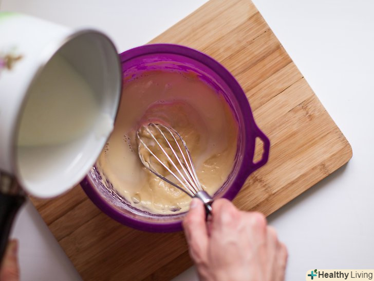 Поступово додайте молочну суміш в вершкове тісто.простежте, щоб молоко було гарячим, але не кипіло. Додавайте його потроху. Якщо ви занадто швидко заллєте гаряче молоко, яйця зваряться.[6]