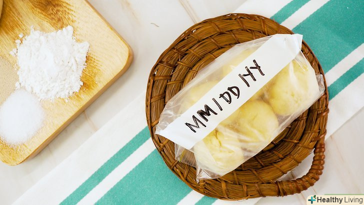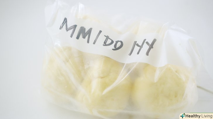 - Перекладіть заморожене тісто в один або кілька відповідних для морозильної камери пакетів.якщо ви розділили тісто на окремі булочки, можна перекласти їх у великі щільно закриваються пакети для заморозки, щоб його зручно було зберігати в морозильній камері. Якщо тісто має вигляд однієї буханки, дістаньте його з форми для випічки хліба, покладіть в пластиковий пакет на застібці і щільно закрийте його.[13]