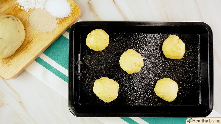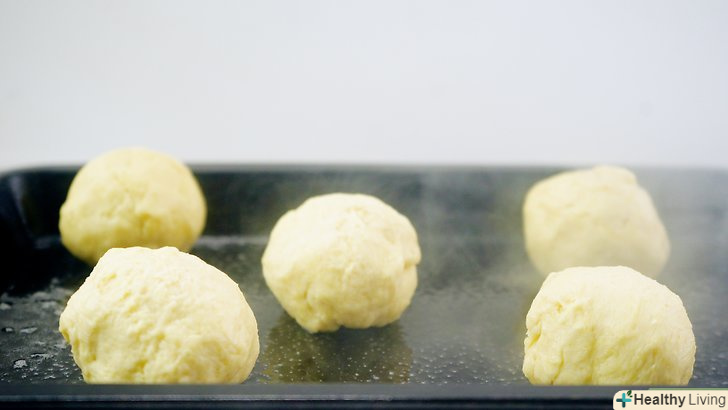- Покладіть тісто на змащене жиром деко або в форму для випічки хліба.якщо ви скачали з тіста окремі кульки, викладіть їх на злегка змащене маслом деко. Якщо тісто має вигляд цілої буханки, покладіть його в злегка змащену жиром форму для випічки хліба і притисніть до кутів, щоб усунути зазори (повітряні кишені).[10]