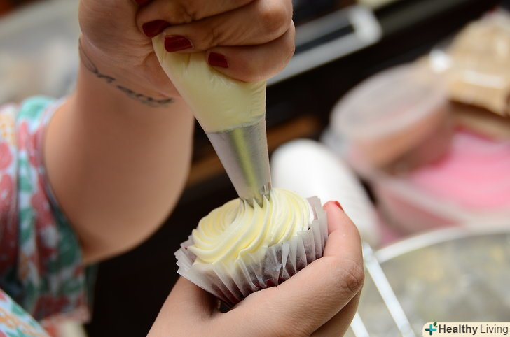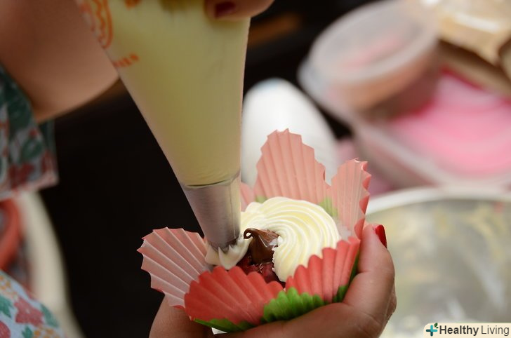 Наповніть тістом формочки кондитерським мішком.це включає в себе заповнення кондитерського мішка тестом для кексу і видавлювання його в кожну форму. Це ідеально підходить для невеликих або мініатюрних кексів, де контроль над тестом має важливе значення (щоб уникнути непривабливих розливів і т.д.). Цей метод є найкращим способом, якщо ви хочете уникнути будь-яких крапель.- Якщо у вас немає кондитерського мішка, просто використовуйте закривається пластиковий пакет з відрізаним кутом.