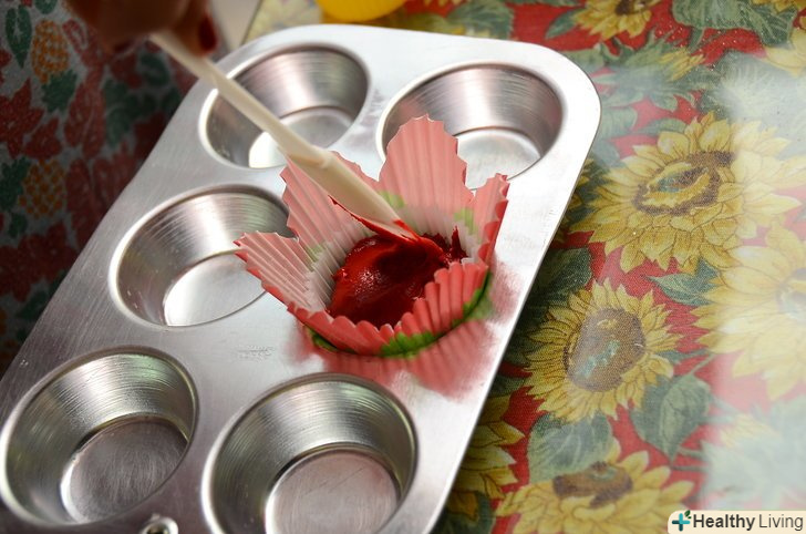 Покладіть ложкою тісто у формочки.використовуйте чайну або десертну ложку, щоб перекласти тісто з миски для змішування в кожну форму або чашку. Прагніть до рівномірного розподілу в усі ємності для кексу.