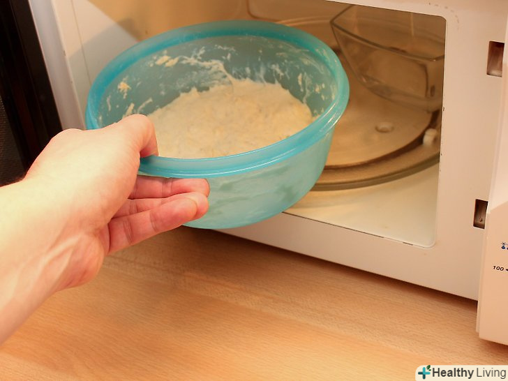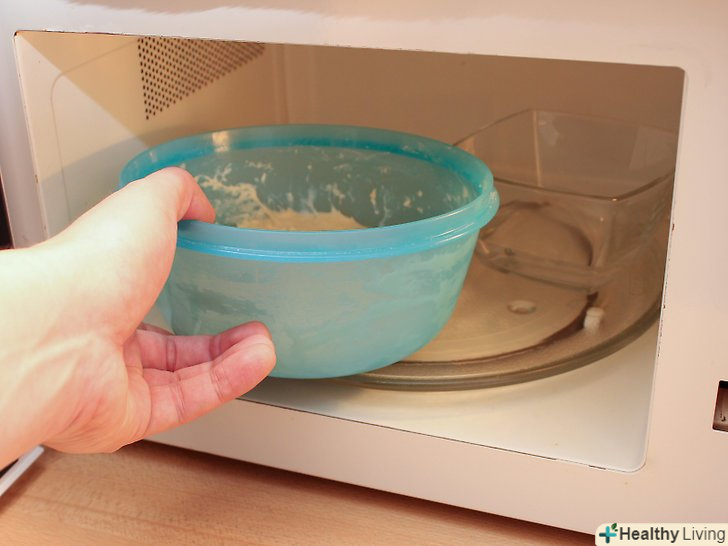 Розігрівайте воду протягом 2 хвилин на високій потужності.через 2 хвилини відкрийте мікрохвильовку і відсуньте склянку з водою в сторону, щоб звільнити місце для миски з тестом. Пересуньте склянку прихватками або кухонним рушником, якщо він гарячий.[5]