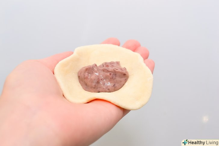 Покладіть коржик на долоню і додайте в середину трохи пасти з червоної квасолі.якщо начинки буде занадто багато, то тісто може розтягнутися при спробі запечатати булочку. Слід дотримуватися правила»чим менше, тим краще"!