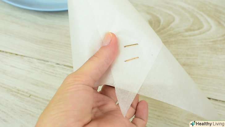 - Можна також зробити для мішка насадку: виріжте смужку з гнучкого картону або алюмінієвої фольги, скрутіть її у вигляді конуса і обріжте його гостру верхівку ножицями. Потім вставте насадку в пакет, перш ніж заповнювати його. Однак така насадка може не давати ідеально рівну струмінь.[3]