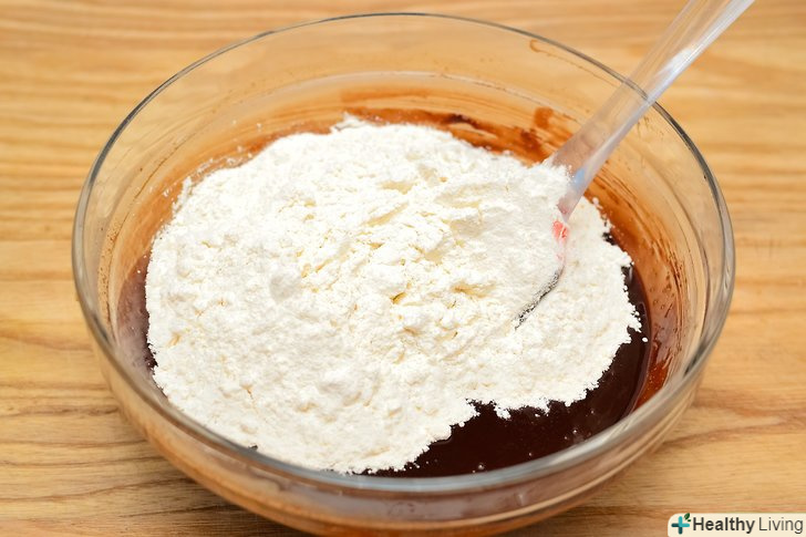 В окремій мисці змішайте борошно і сіль.- Додайте це в шоколадну суміш і розмішайте до однорідної консистенції.