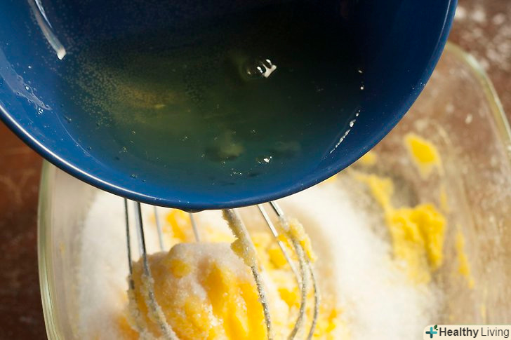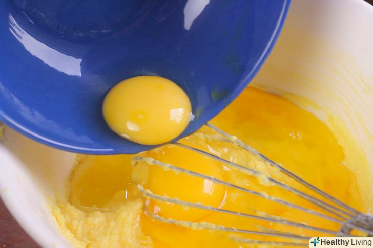 Додайте яйця і ванільний екстракт.залийте в суміш масла і цукру яйця і ванільний екстракт. Ще раз перемішайте суміш блендером, щоб яйця повністю розчинилися.