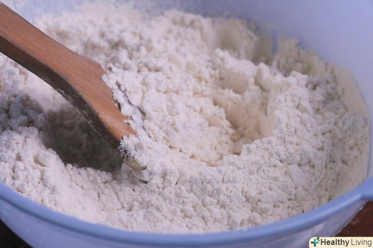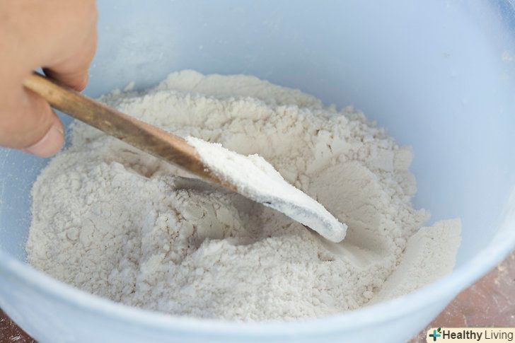 Змішайте сухі інгредієнти в окремій мисці.засипте в миску борошно, пекарський порошок і харчову соду. Перемішайте їх дерев'яною лопаткою.