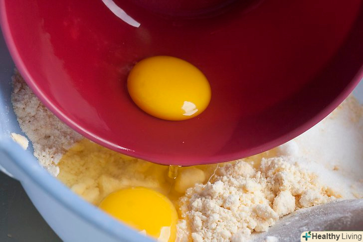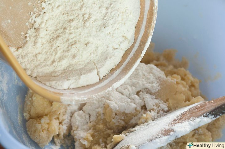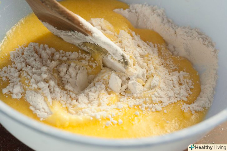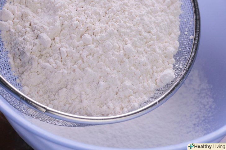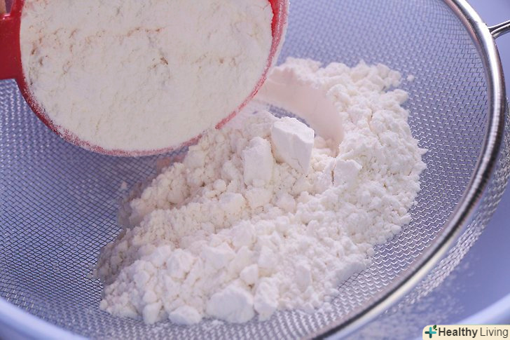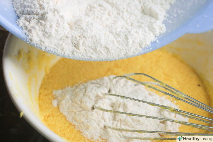 ПросійтеСухі інгредієнти, за винятком цукру. візьміть велику миску і просійте в неї борошно для випічки (якщо у вас немає спеціального борошна для випічки, змішайте пшеничне борошно вищого сорту і кукурудзяний крохмаль з розрахунку 2 столових ложки крохмалю на склянку борошна), пекарський порошок і сіль. Як слід просійте сухі інгредієнти, щоб вони стали повітряними і пухнастими.