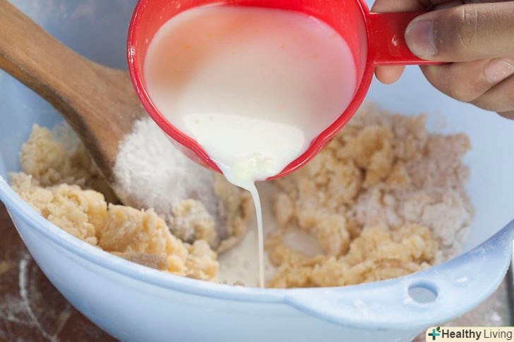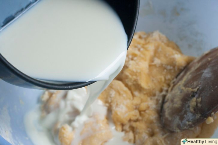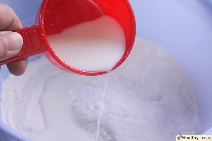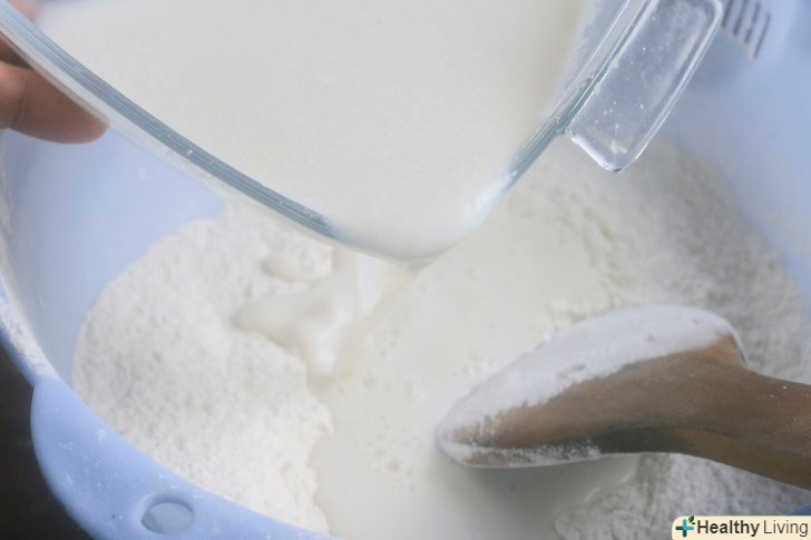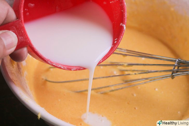 Додайте ½ молока.відлийте ½ молока і додайте його в суміш. Перемішайте суміш на середній швидкості.
