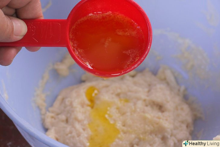 Додайте топлене масло і оцет.залийте в тісто розтоплене вершкове масло і оцет і перемішайте, щоб вийшла однорідна суміш. Після цього тісто стане гладким і блискучим.