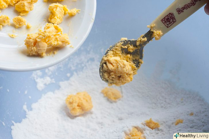 Додайте вершкове масло, по одній чайній ложці за раз.візьміть чайну ложку вершкового масла і додайте його до сухих інгредієнтів. Перемішайте інгредієнти електричним або ручним блендером. Продовжуйте поступово додавати вершкове масло, поки не використовуєте всі ½ склянки (120 грамів) масла. В результаті повинна вийти суміш у вигляді розсипчастого піску.