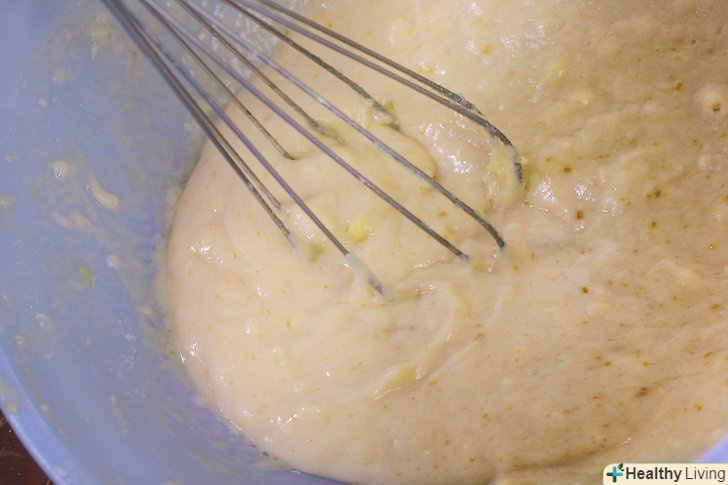 Перемішайте блендером всі інгредієнти.викладіть інгредієнти в миску і перемішуйте їх електричним або ручним блендером до тих пір, поки не залишиться слідів борошна. В результаті повинно вийти світло-жовте гладке тісто.