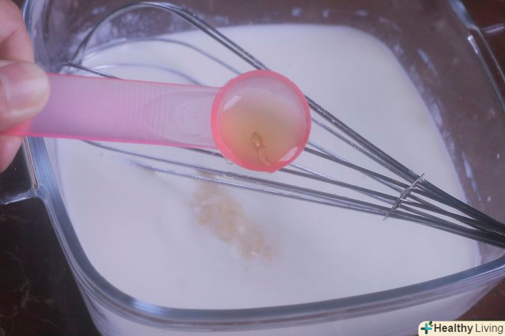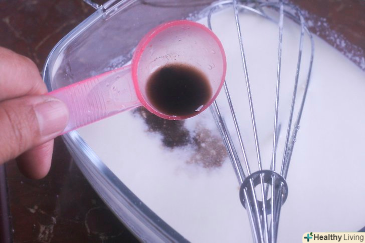 Додайте в суміш з соєвим молоком рідкі інгредієнти.залийте в суміш мигдальний і ванільний екстракти, лимонний сік, воду і яблучний оцет. Як слід перемішайте суміш мутовкой або виделкою.