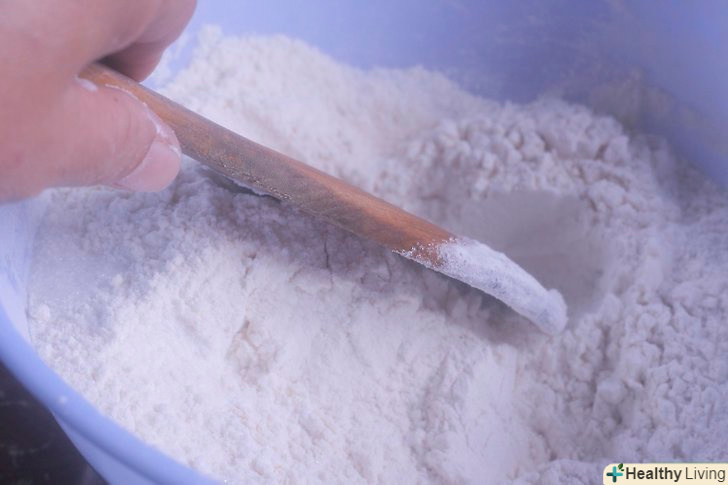 Змішайте сухі інгредієнти в окремій мисці.візьміть велику миску і засипте в неї пекарський порошок, харчову соду, ксантанову камедь (харчову добавку Е415), сіль і безглютенове борошно. Як слід перемішайте інгредієнти дерев'яною ложкою.