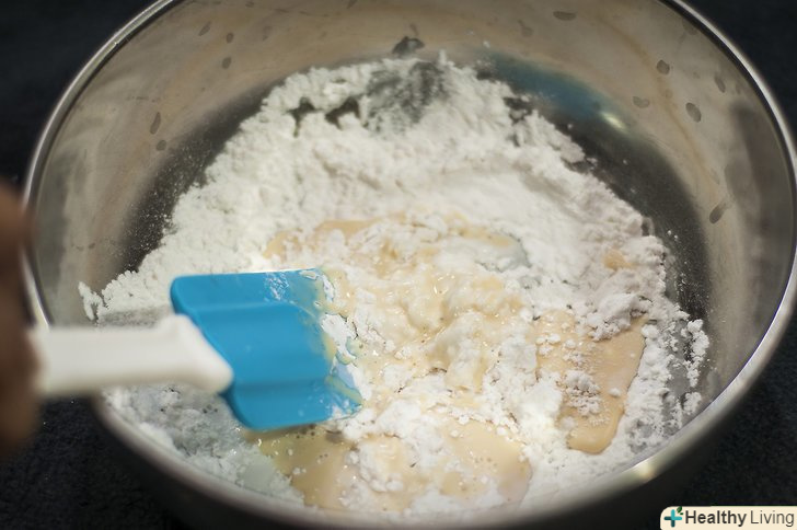 Змішайте рідкі інгредієнти з сухими.додайте в миску сіль, борошно, ваніль, кефір (або пахту), а також воду.