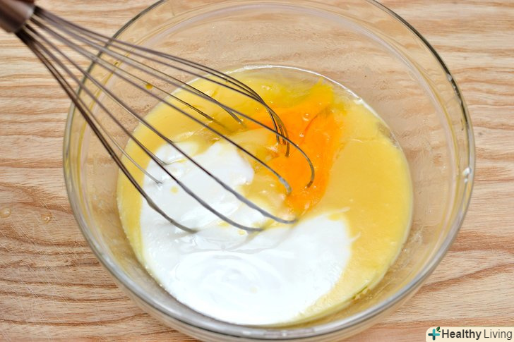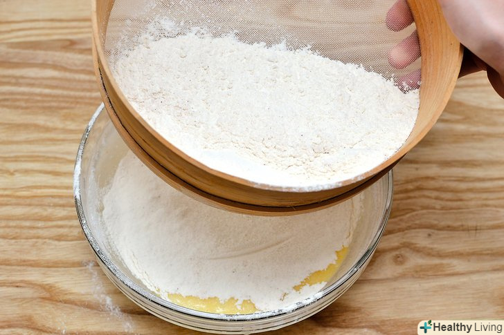 Змішайте сухі та рідкі інгредієнти.просійте всі сухі інгредієнти в миску з рідкими інгредієнтами.- Щоб рідкі інгредієнти краще змішалися з сухими, додавайте сухі інгредієнти поступово і потроху і добре перемішуйте, перш ніж додати ще.