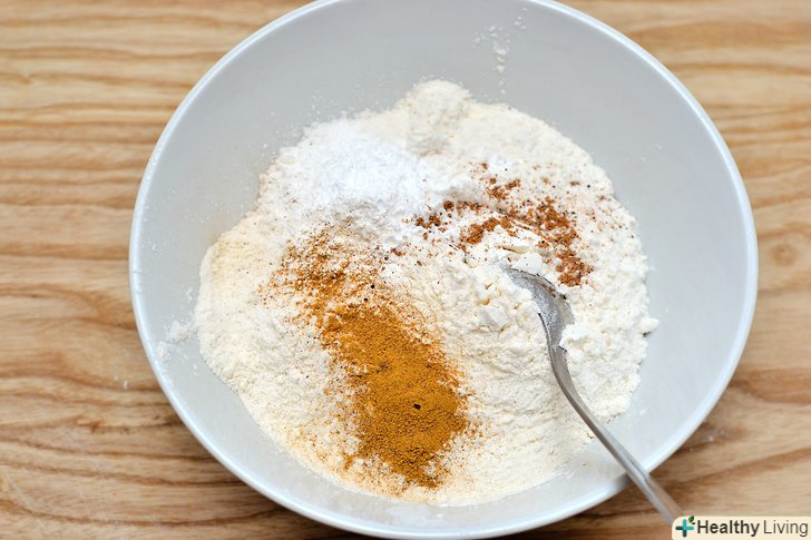 Змішайте сухі інгредієнти.візьміть миску середнього розміру і змішайте в ній корицю, борошно, харчову соду, пекарський порошок, сіль і мускатний горіх. Перемішуйте перераховані інгредієнти за допомогою металевого віночка.