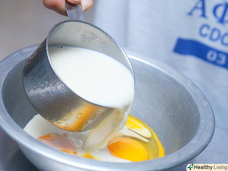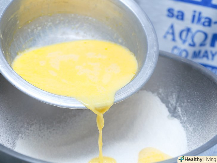 Змішайте вміст двох мисок.вилийте рідкі інгредієнти в сухі. Потім акуратно змішайте їх.[12]- В тесті можуть утворитися грудочки. З занадто інтенсивно збитого тіста виходять щільні млинці.